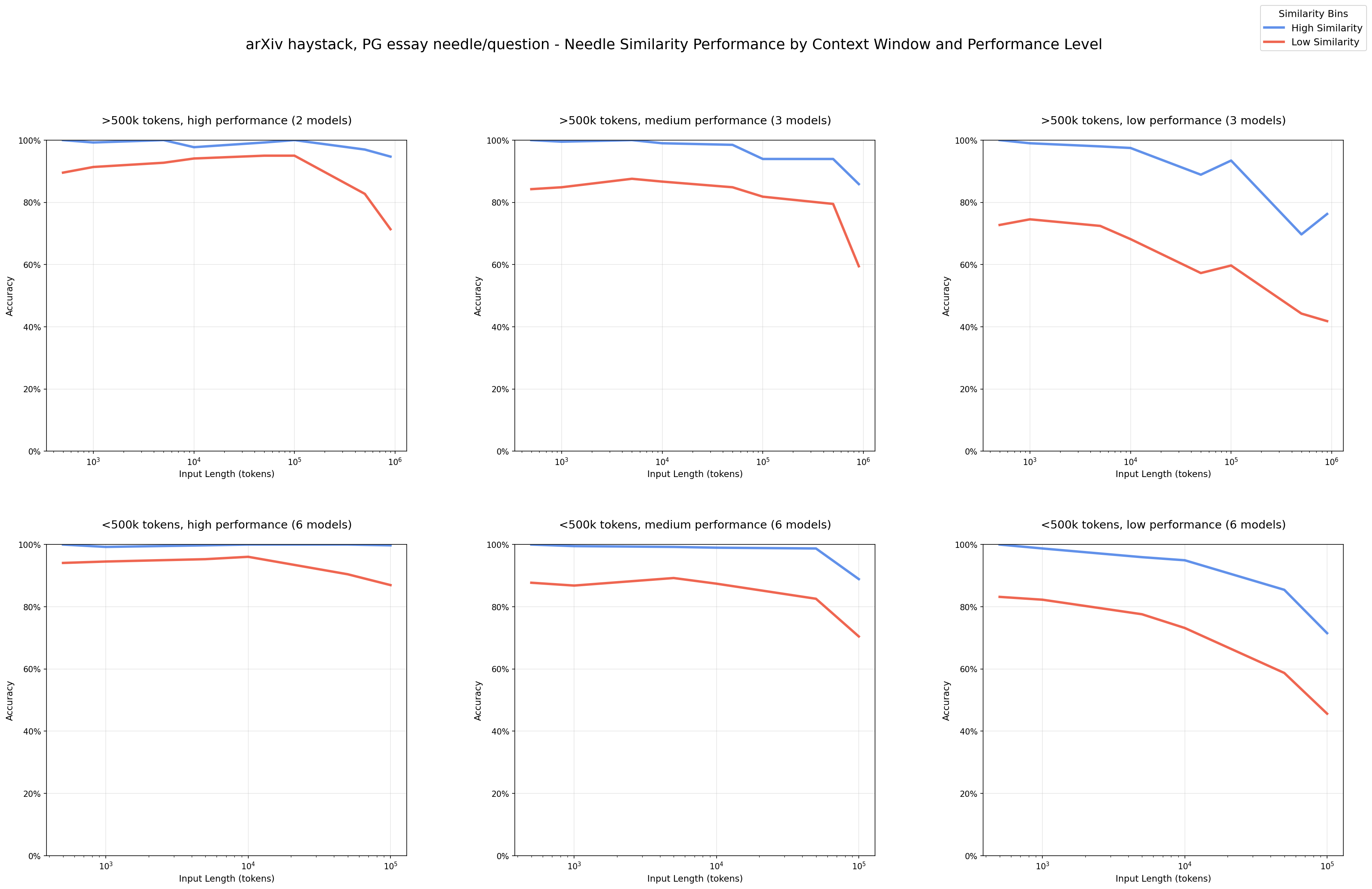 We vary the similarity of our needle-question pairs, quantified by the cosine similarity of their embeddings. We find that as needle-question similarity decreases, model performance degrades more significantly with increasing input length. This reflects more realistic scenarios where exact question-answer matches are rare, and semantic ambiguity compounds the challenge of long input processing.