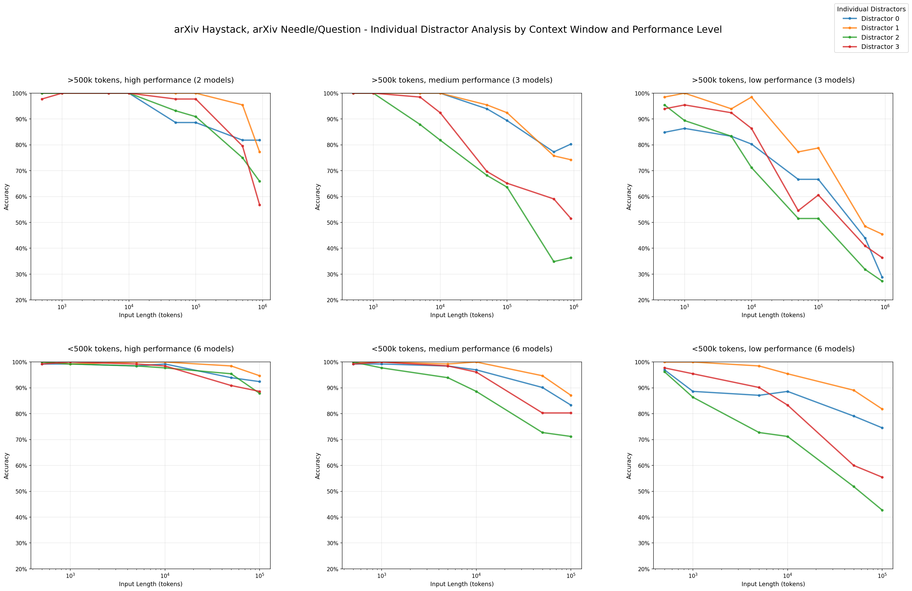 - Distractors have non-uniform impact on model performance with regards to how distracting they are relative to each other. We see this impact more prominently as input length increases, and observe distinctions in how various models respond to them.