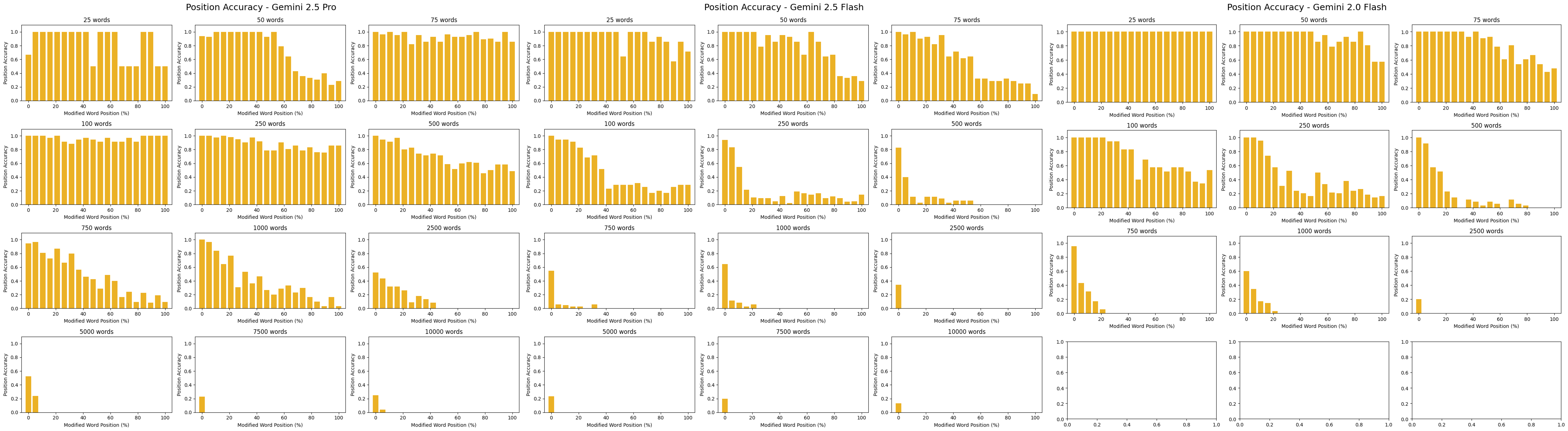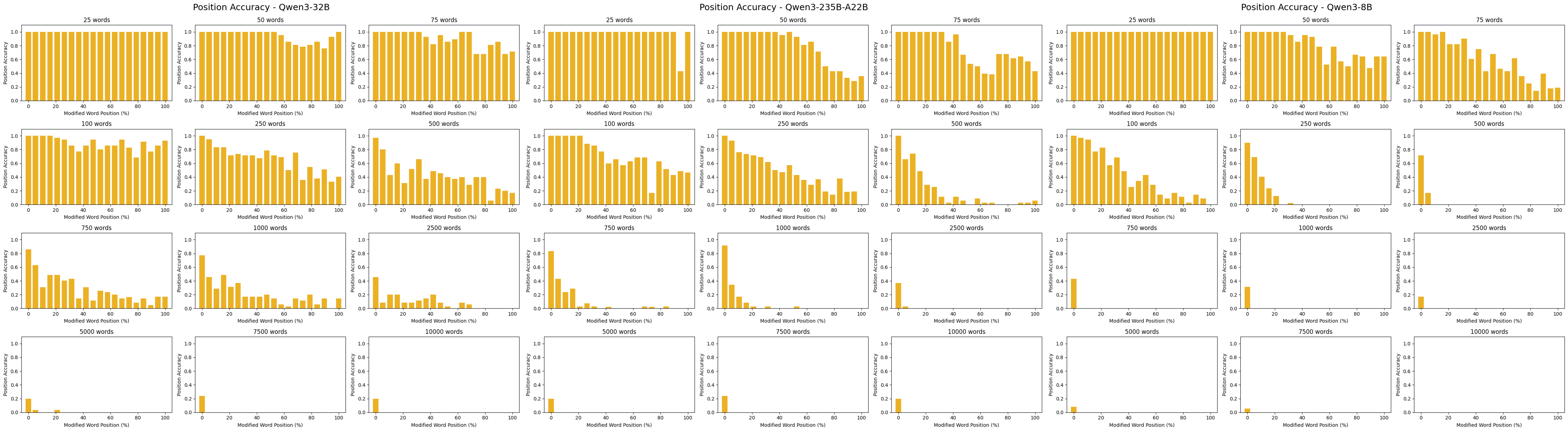 We also measure the position accuracy: whether the unique word appears in the correct position. Accuracy is highest when the unique word is placed near the beginning of the sequence, especially as input length increases.
