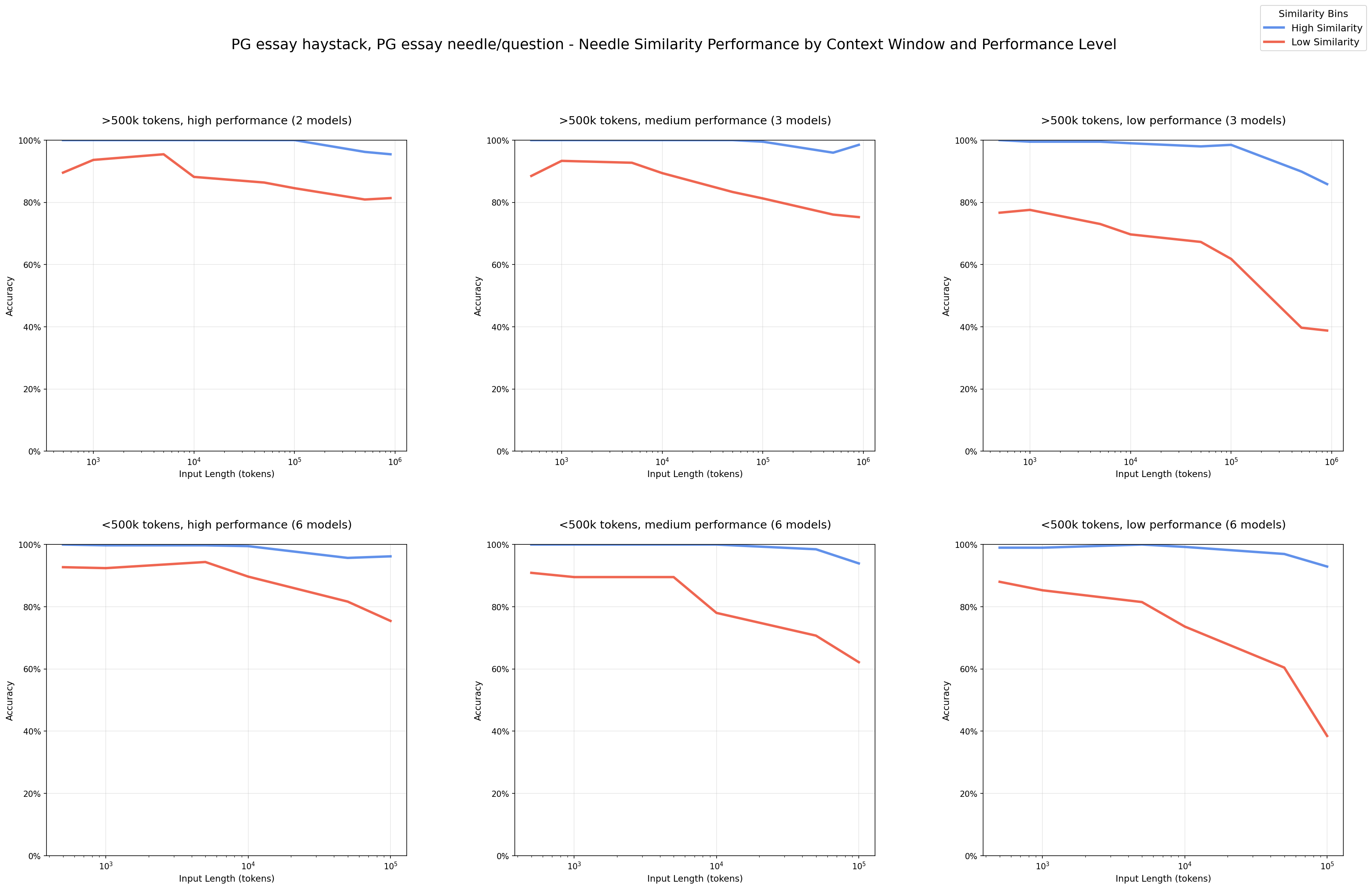 We observe a clear pattern that performance degrades more quickly in input length with lower similarity needle-question pairs.
