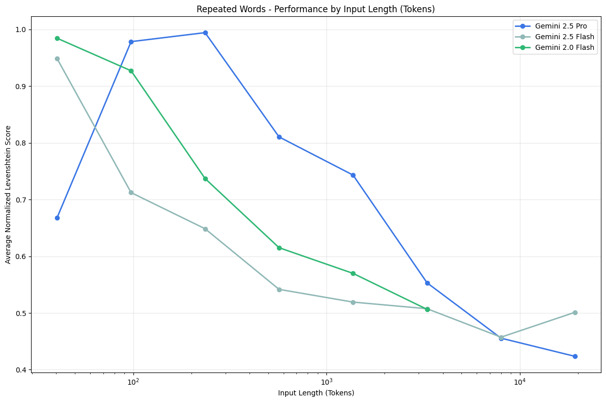Generally, we see a performance degradation across models as context length increases. With Gemini 2.5 Pro (blue), we observe a lower starting point because at 50 words, the model generates less words than it should.