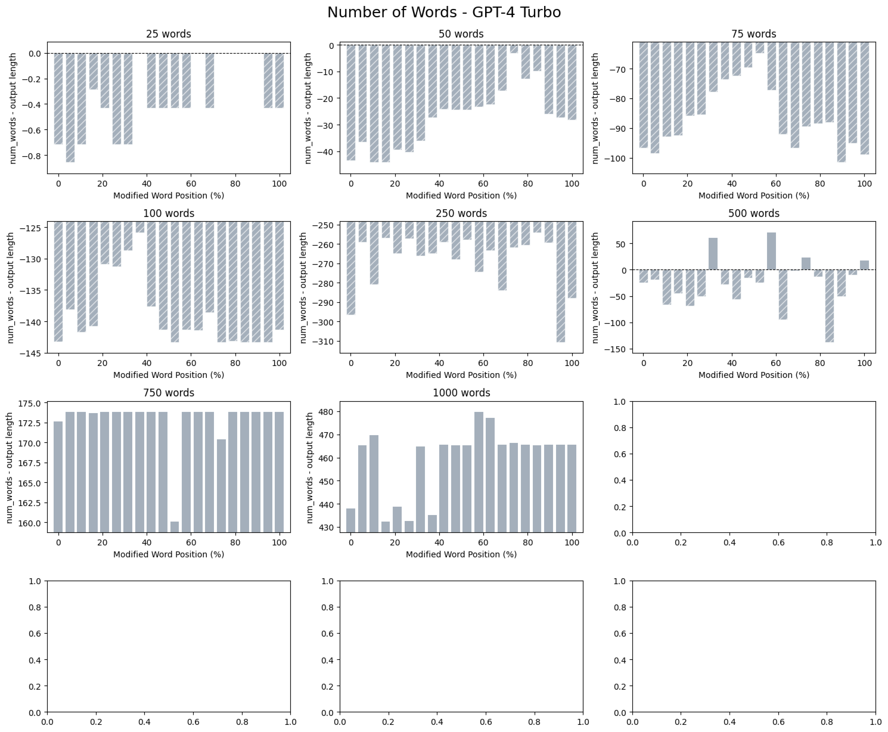 We also observe a local performance peak around 500 words for GPT-4 turbo. Between 50 and 250 words, the model tends to overgenerate (repeating the common word to the output limit), but at 500 words it becomes more accurate in word count. Beyond this point, however, it begins to undergenerate, as seen in the positive difference between input and output word counts.