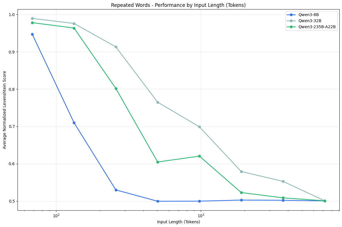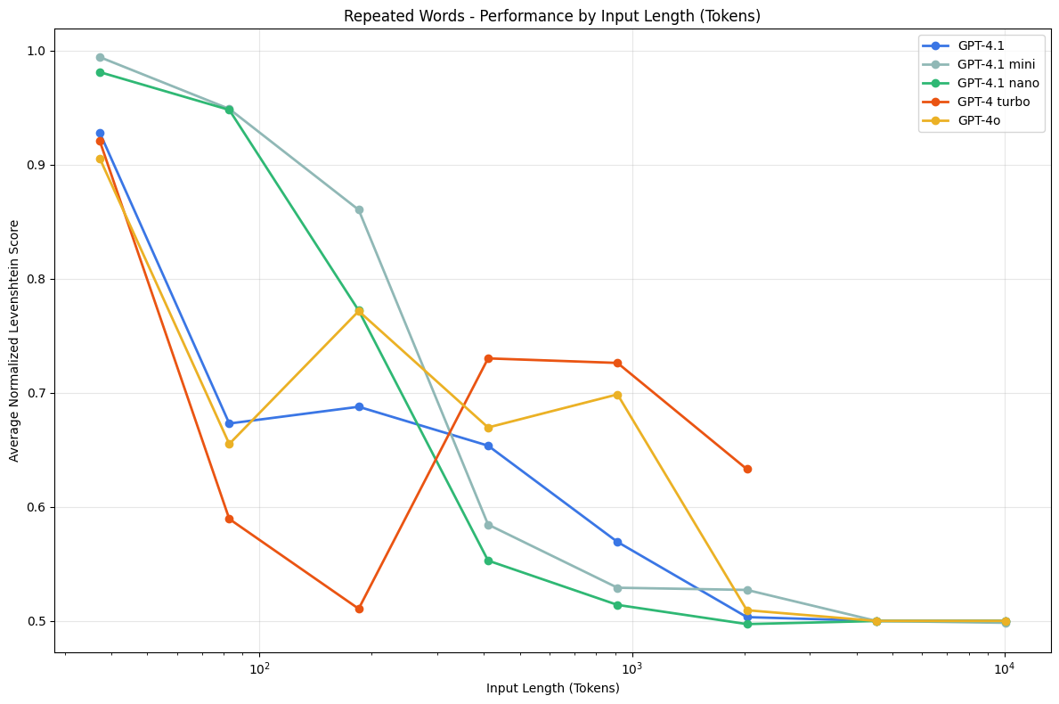 Additionally, we include a conversational question-answer evaluation using LongMemEval [2], as well as a synthetic task in which models replicate a series of repeated words. Each task remains intentionally simple and is deliberately controlled to isolate the impact of context length alone.