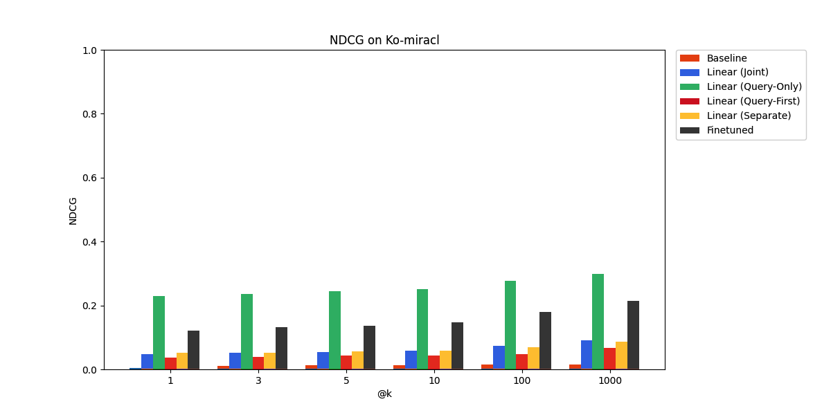 Finally, on Ko-miracl, a Korean language benchmark, the language gap proves too difficult to bridge through our adaptation approaches.