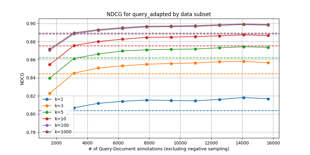 Another avenue we briefly explored was the use of synthetic data to augment our training set. By generating synthetic documents to serve as positive examples for queries, we hoped to augment the data with positives in addition to the negative sampling. However, our initial attempts did not yield significant improvements in retrieval performance. This could be due to the challenges in generating realistic synthetic data that remains in-distribution for the dataset. Due to time constraints, we were unable to fully explore this approach, but we believe that further research into effective methods for generating and utilizing synthetic data could potentially enhance the adaptation process, particularly with the promising results by Wang et al on the use of synthetic data for improving embeddings.