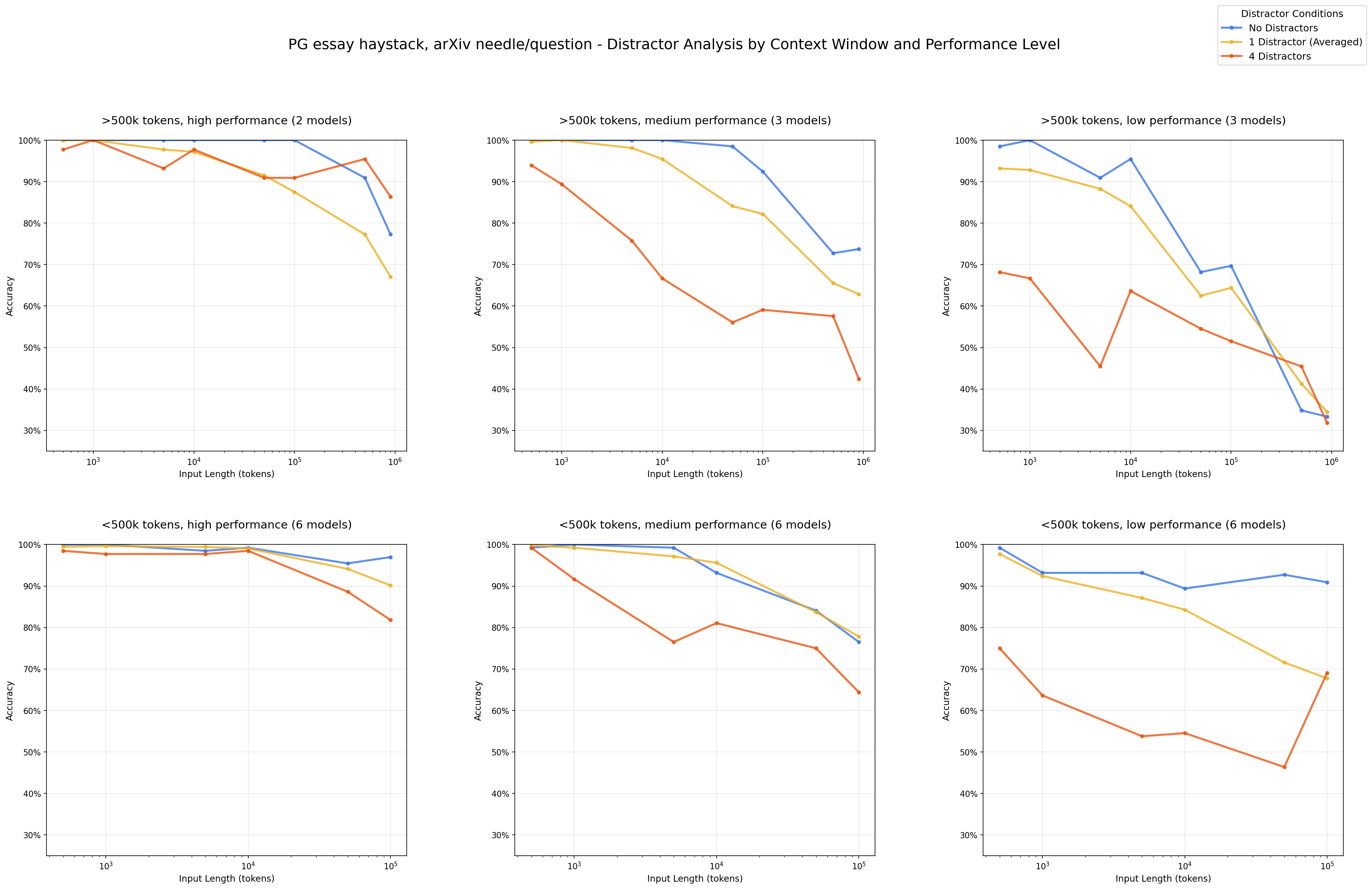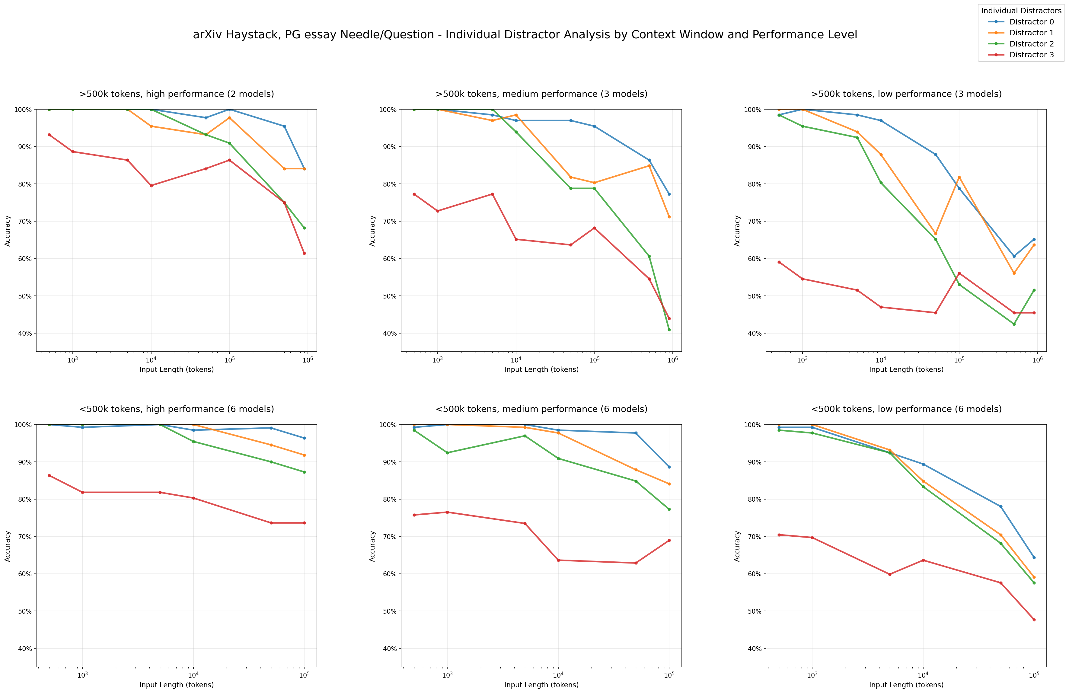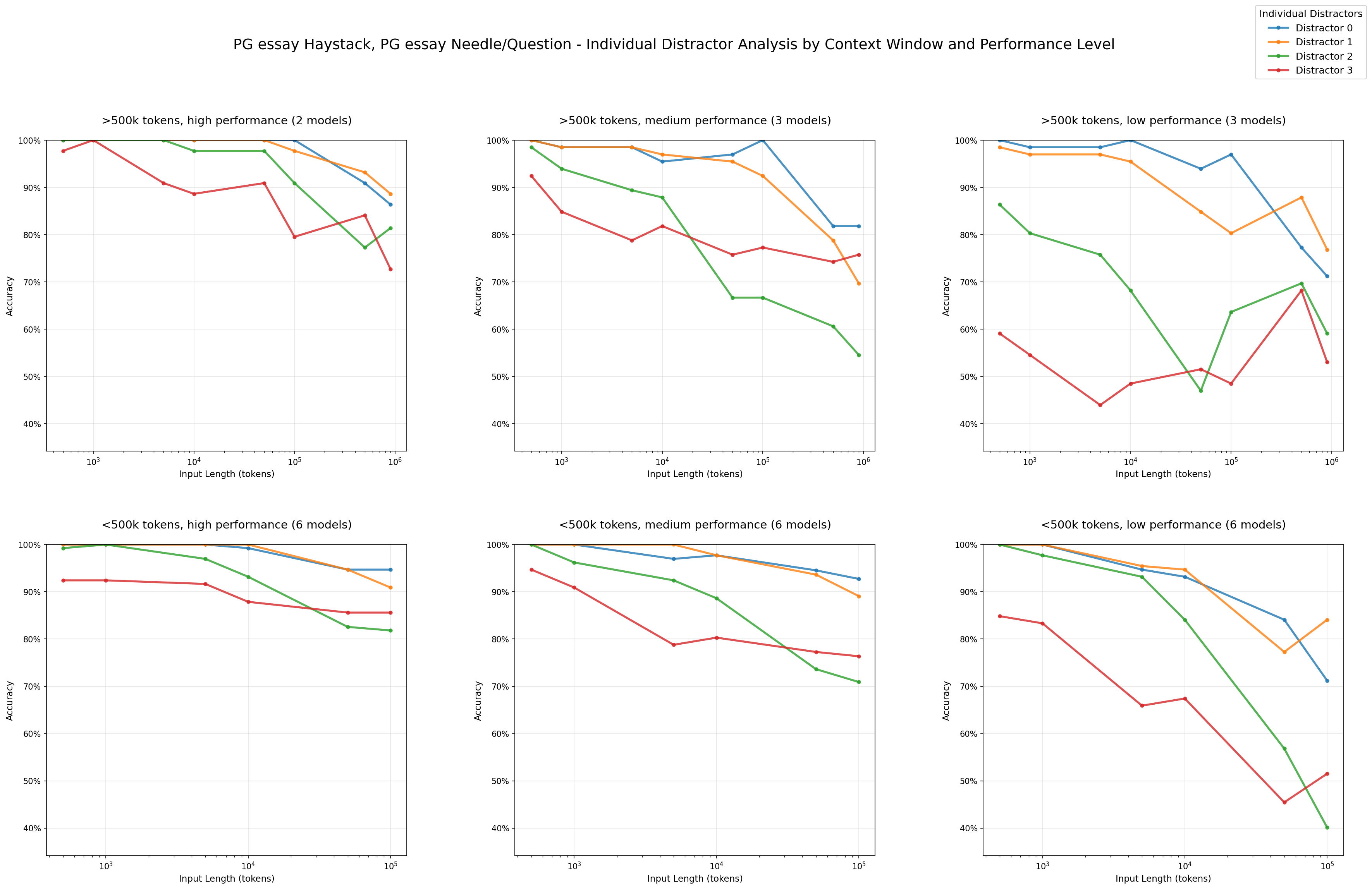 - Distractors have non-uniform impact on model performance with regards to how distracting they are relative to each other. We see this impact more prominently as input length increases, and observe distinctions in how various models respond to them.