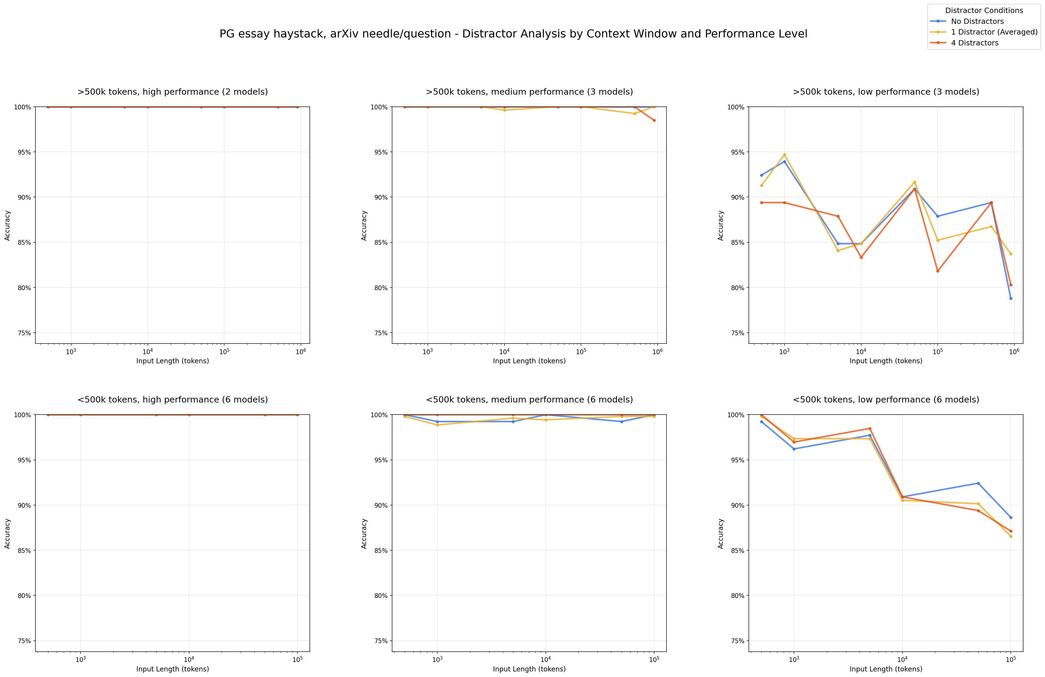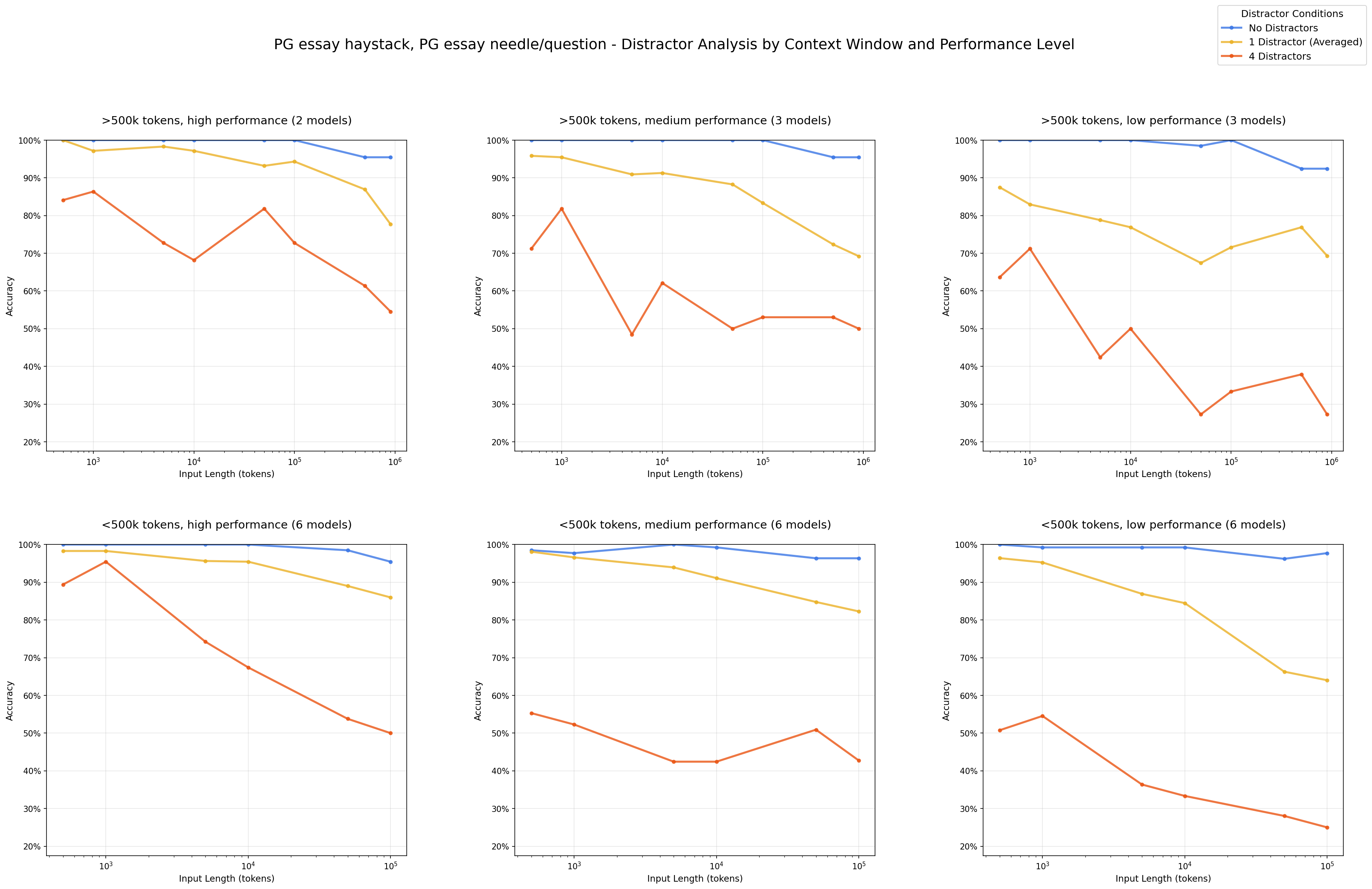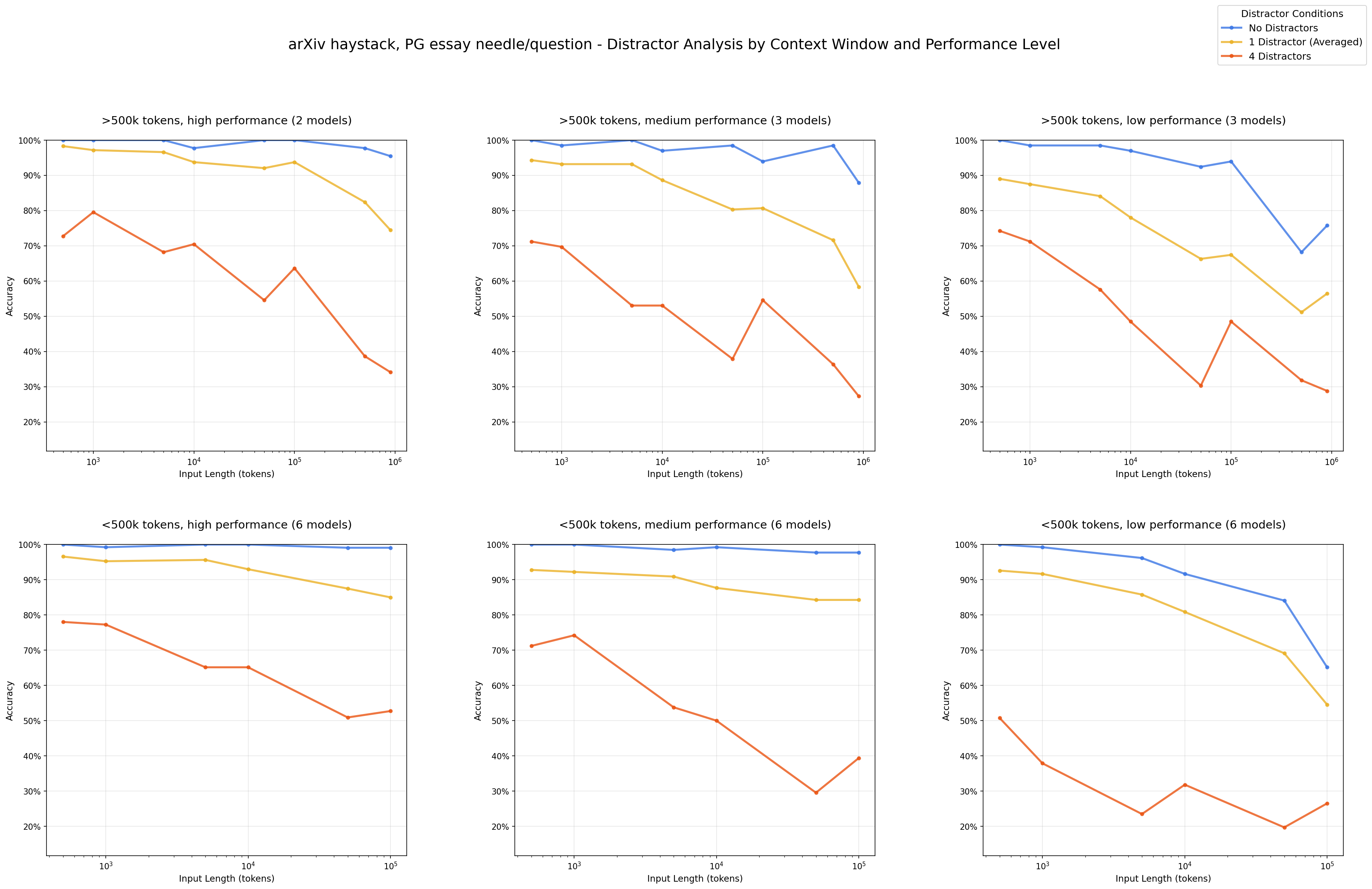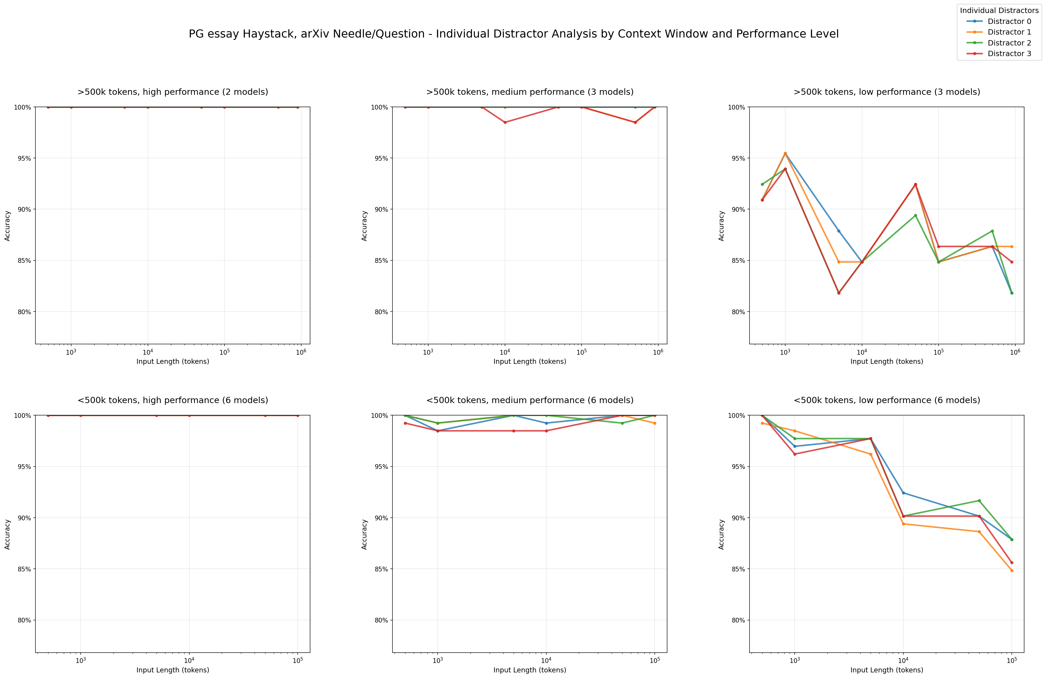 - Distractors have non-uniform impact on model performance with regards to how distracting they are relative to each other. We see this impact more prominently as input length increases, and observe distinctions in how various models respond to them.