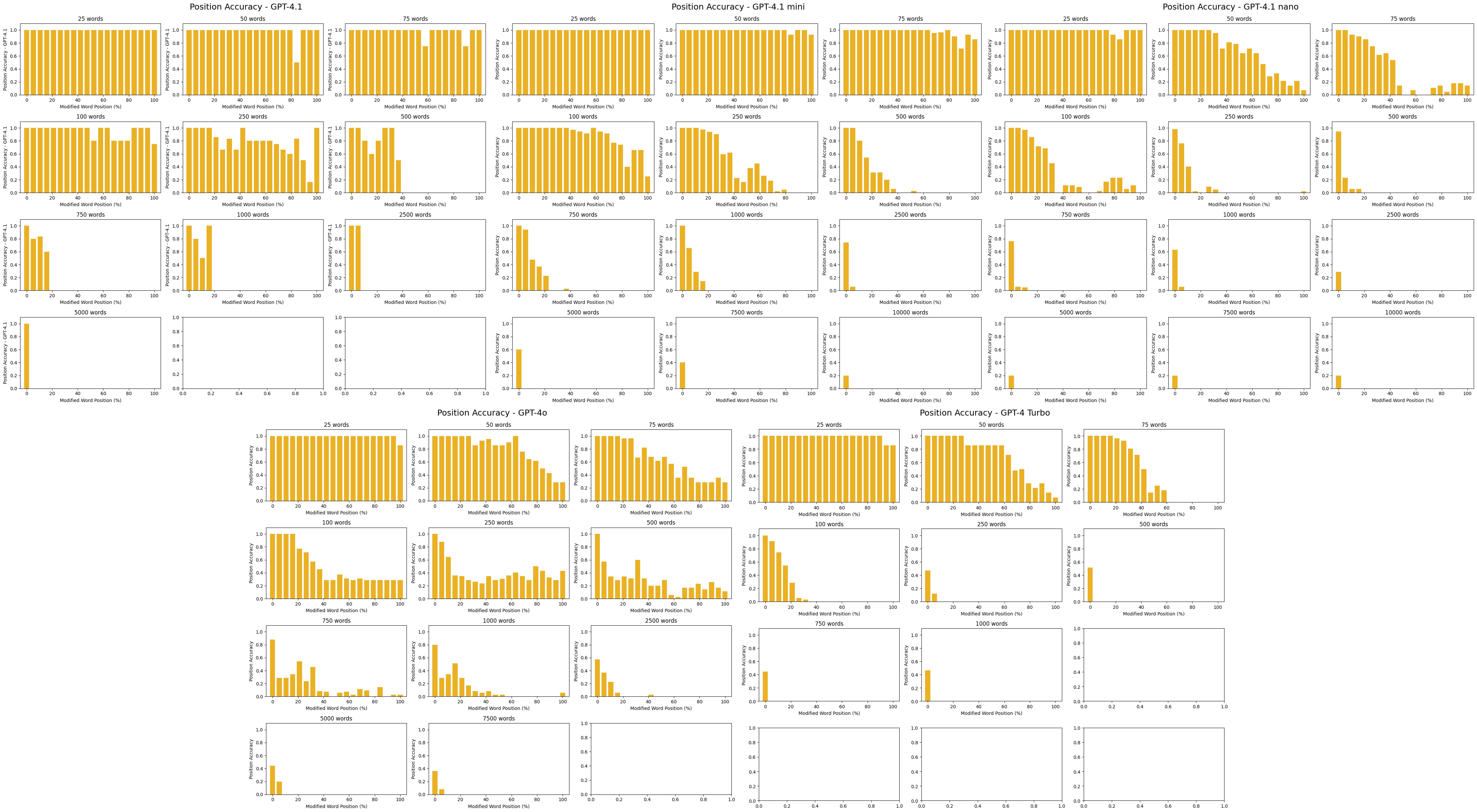 We also measure the position accuracy: whether the unique word appears in the correct position. Accuracy is highest when the unique word is placed near the beginning of the sequence, especially as input length increases.