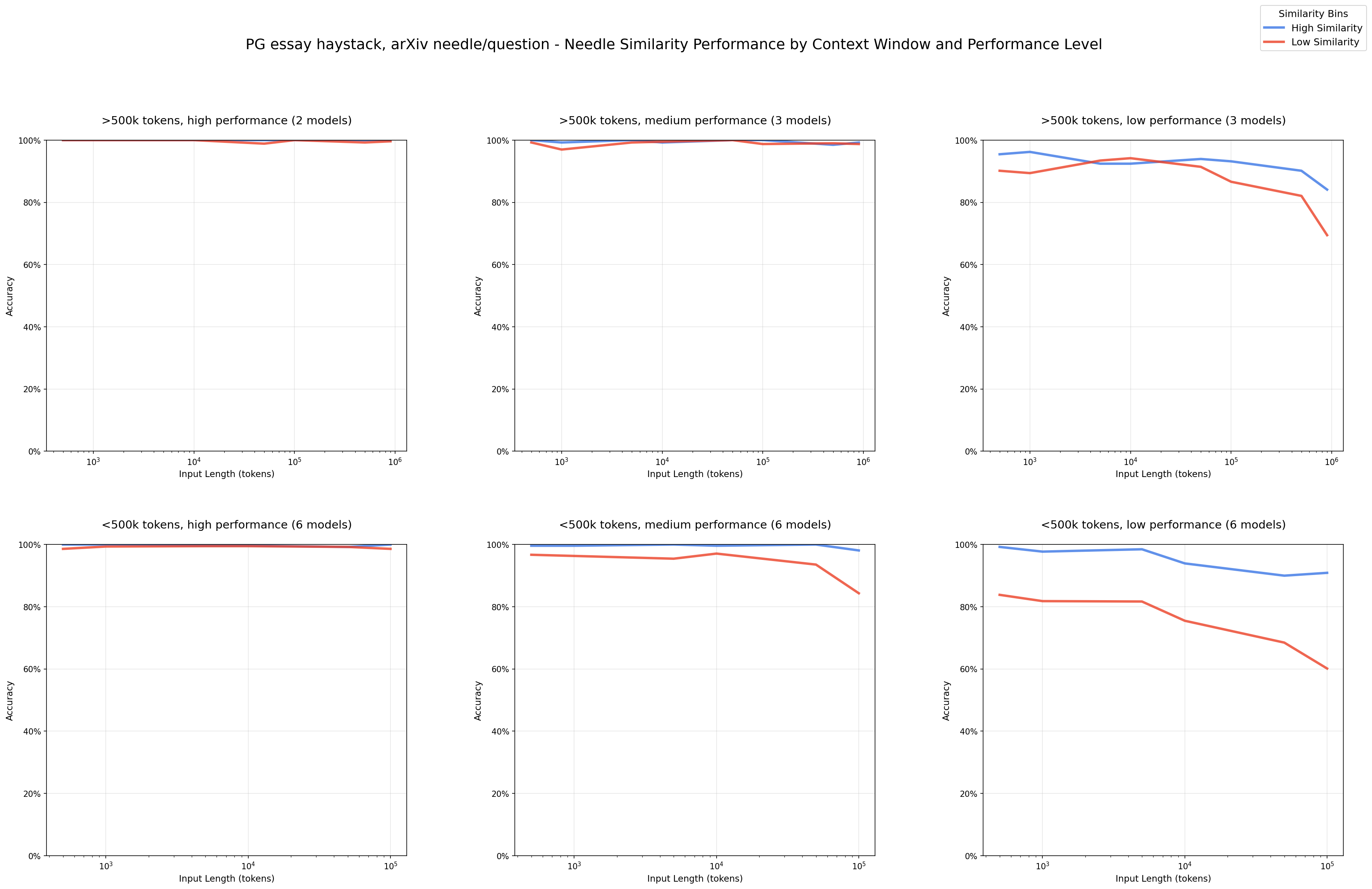 At short input lengths, the models perform well even on low-similarity pairs. We see this most clearly in the high/medium-performance models, demonstrating that these models are capable of succeeding at this task for all needle-question pairs.