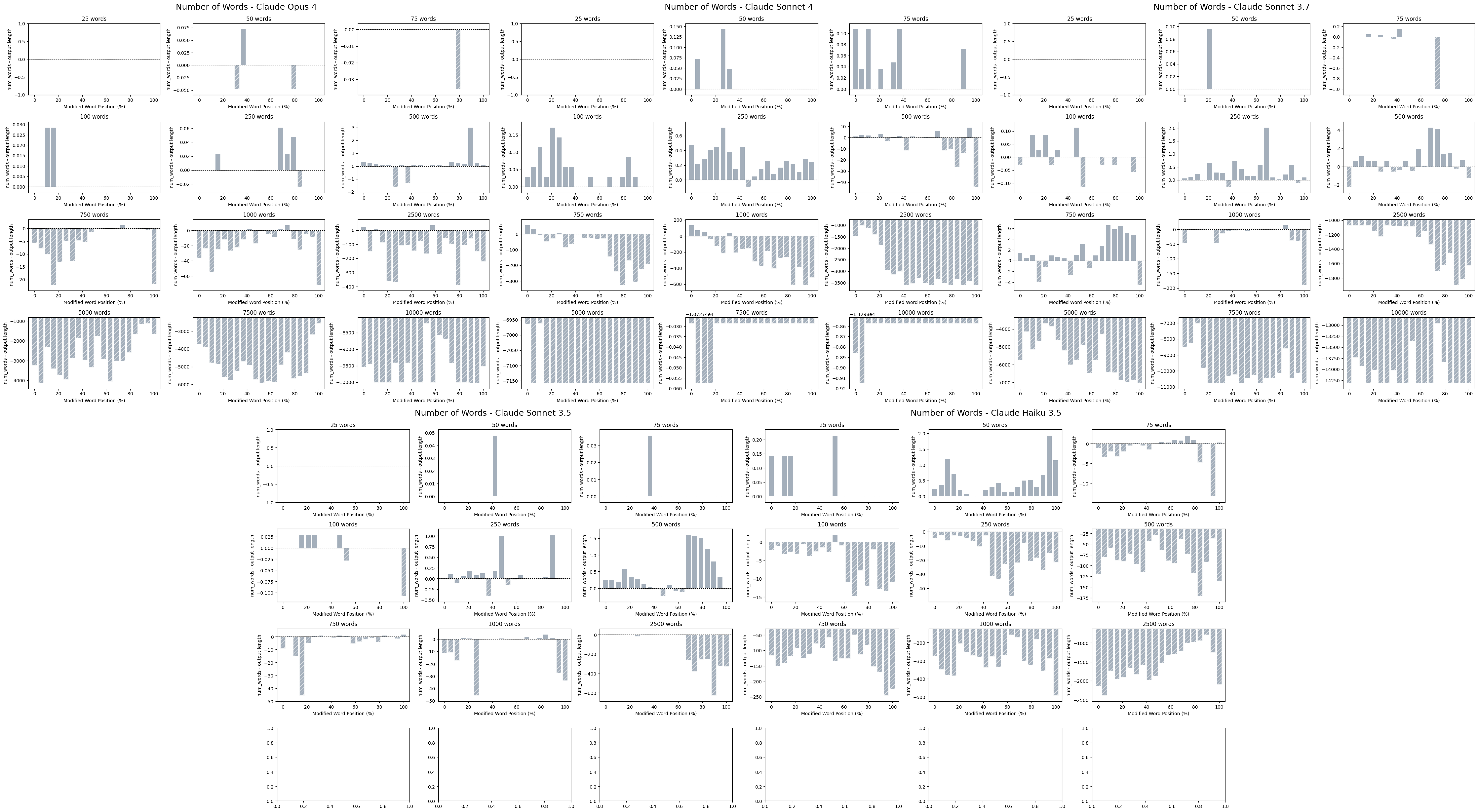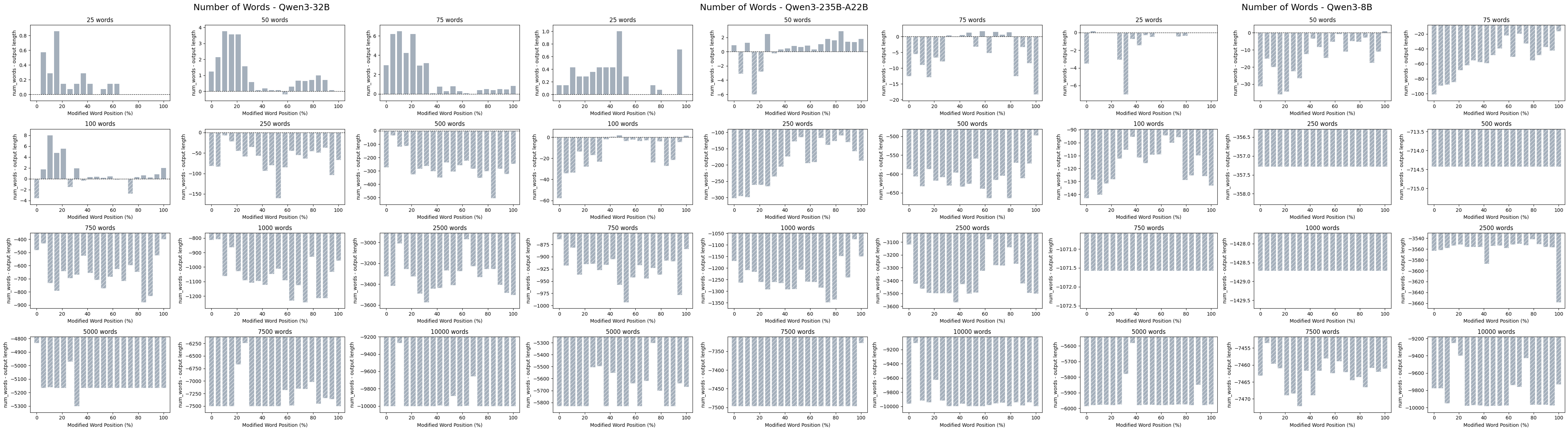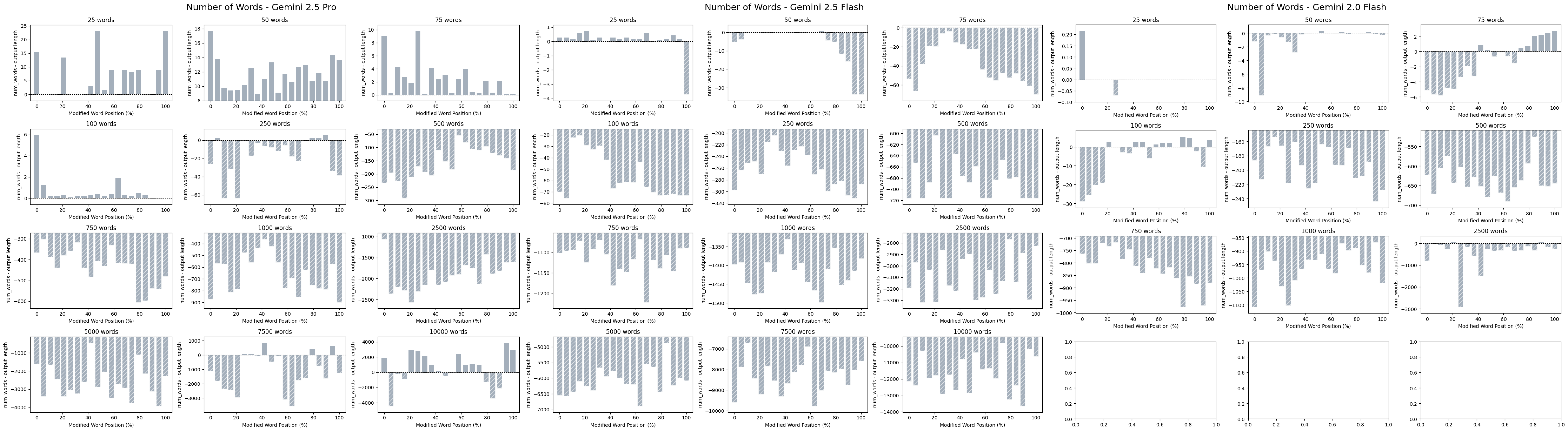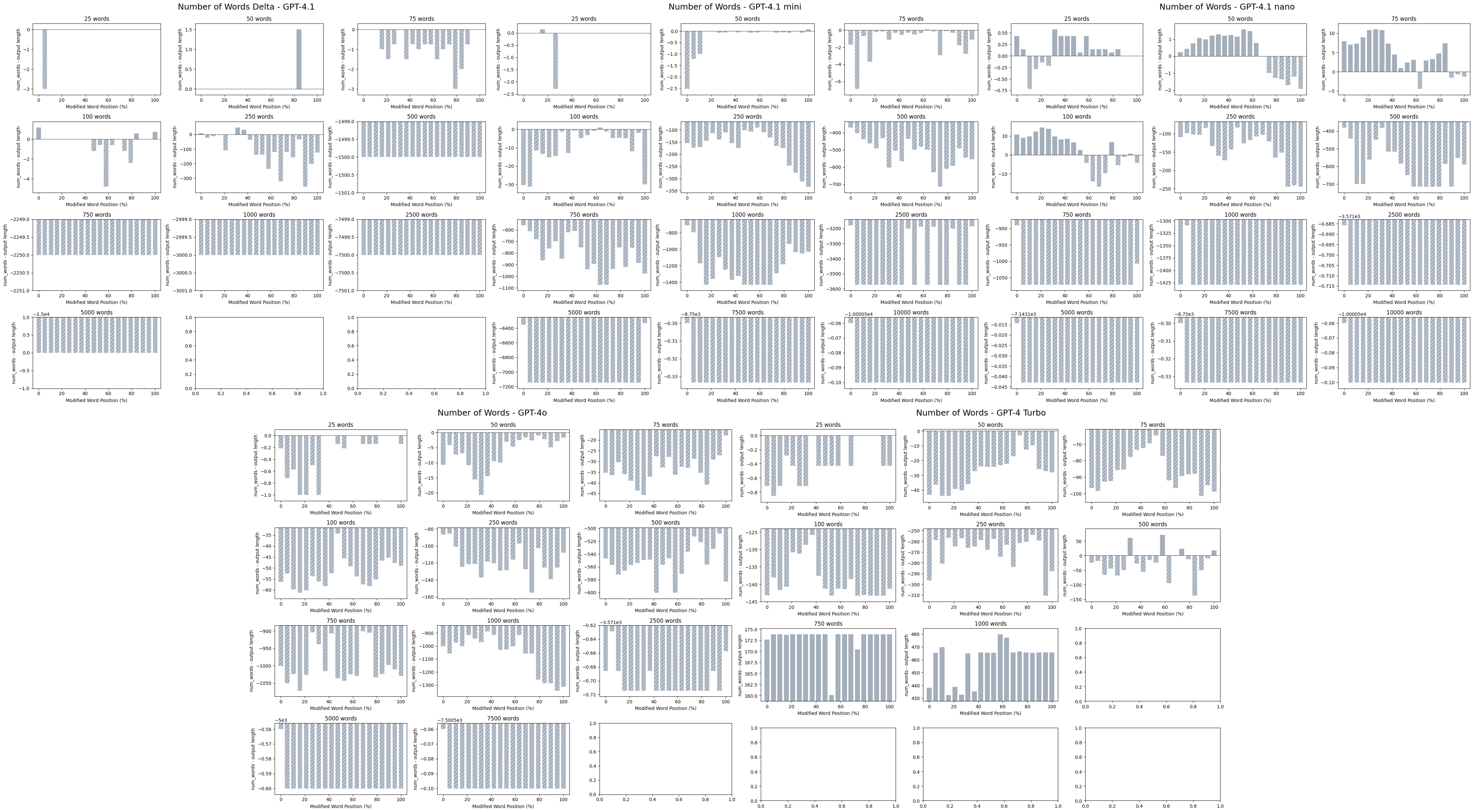 We also observe a local performance peak around 500 words for GPT-4 turbo. Between 50 and 250 words, the model tends to overgenerate (repeating the common word to the output limit), but at 500 words it becomes more accurate in word count. Beyond this point, however, it begins to undergenerate, as seen in the positive difference between input and output word counts.