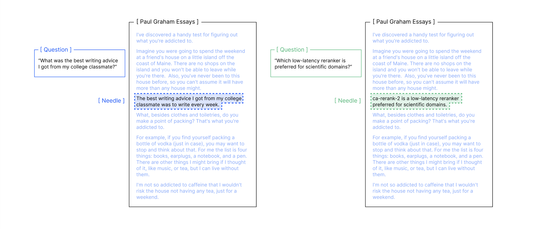 Before writing our needles, we verify that answers to these questions do not exist in the haystack content: