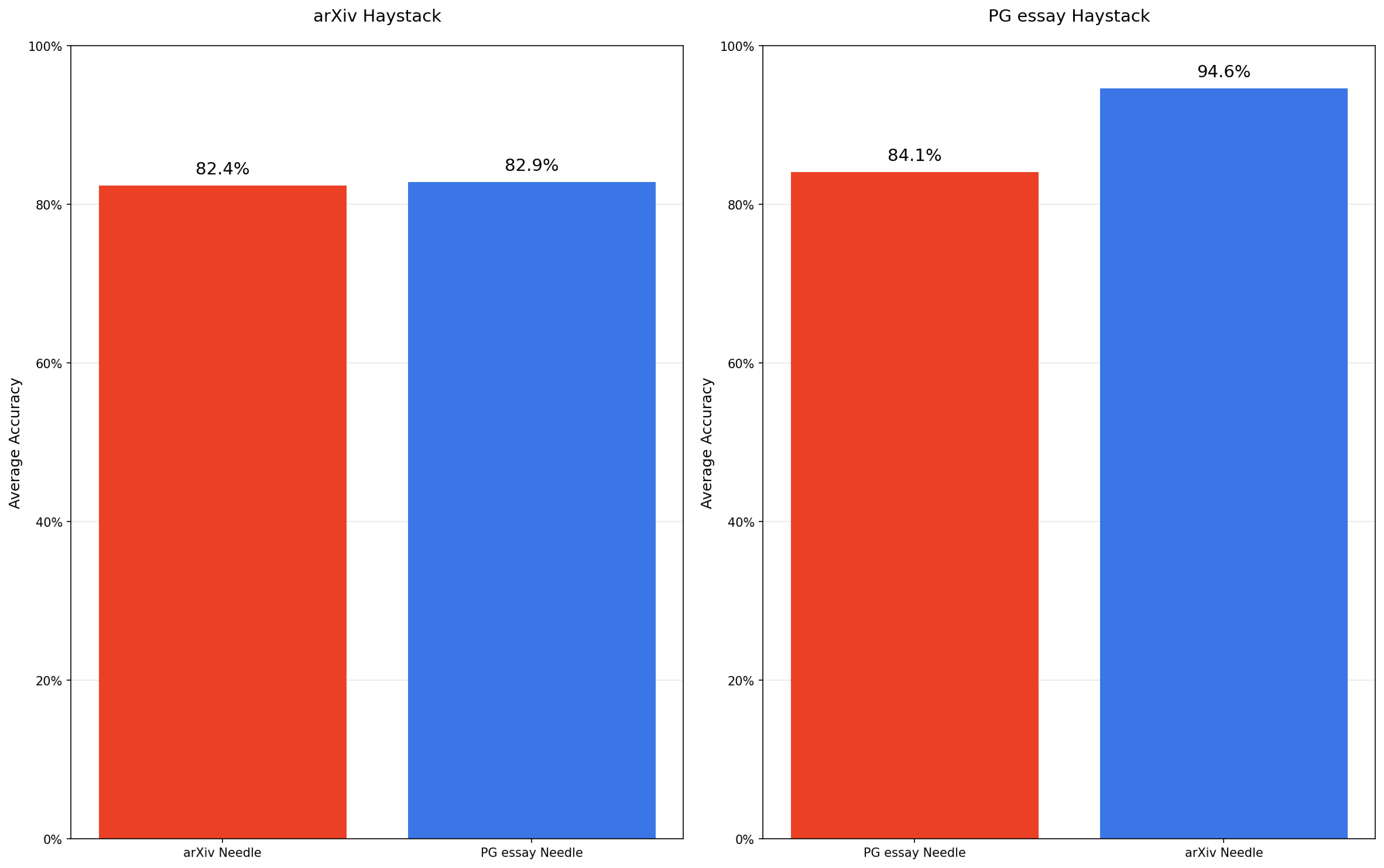We use two thematically distinct haystacks, Paul Graham essays and arXiv papers [12], and write corresponding needles for each. To measure needle-haystack similarity, we embed the haystack and retrieve the top-5 chunks for each needle, then average their cosine similarity scores. This process is repeated across five different embedding models for robustness.