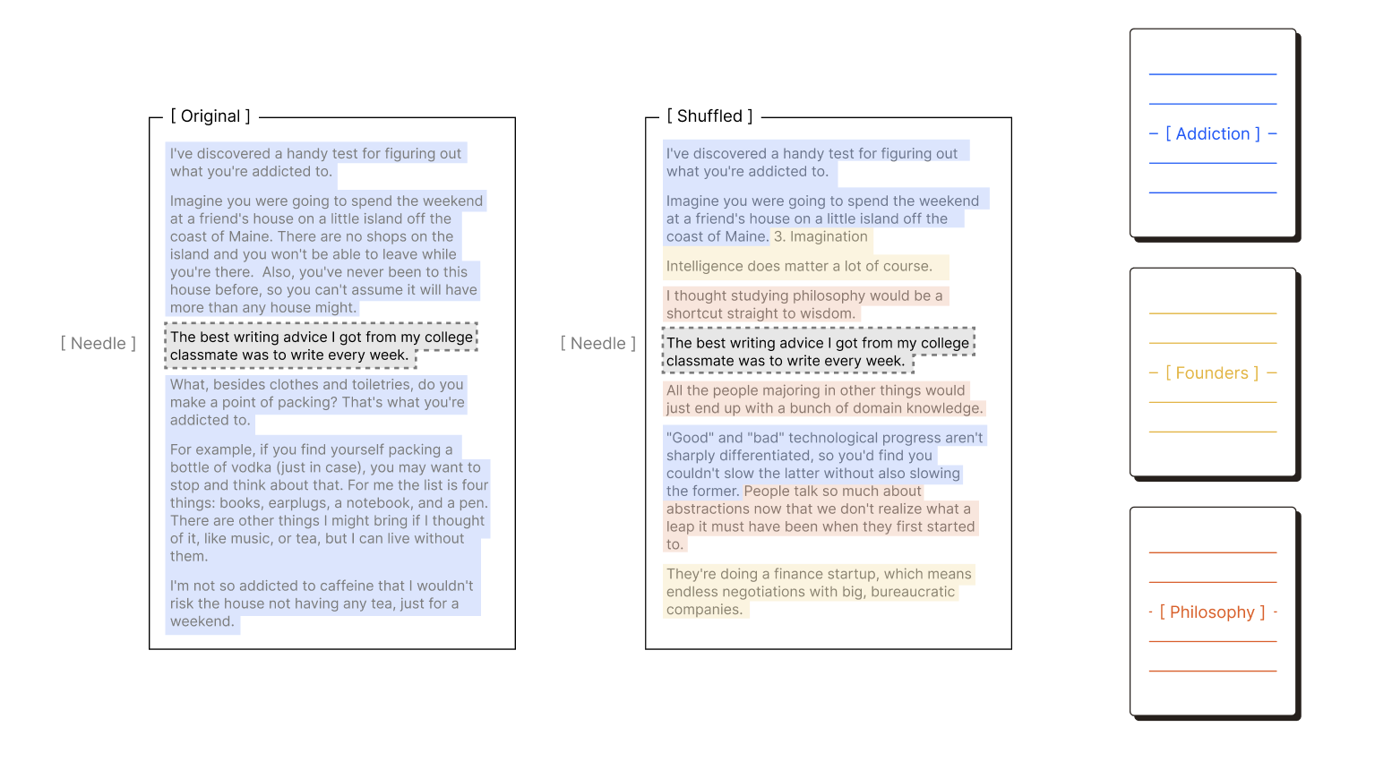 - Shuffled: sentences are randomly reordered throughout the haystack to maintain the same overall topic without logical continuity