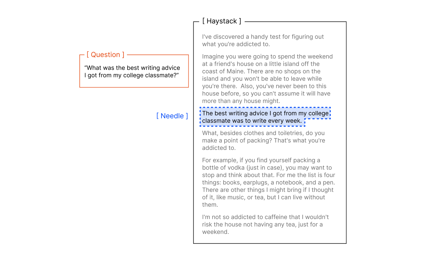 The classic Needle in a Haystack task involves placing a random fact (the 'needle') in the middle of a long context window (the 'haystack'), then asking the model about that fact.