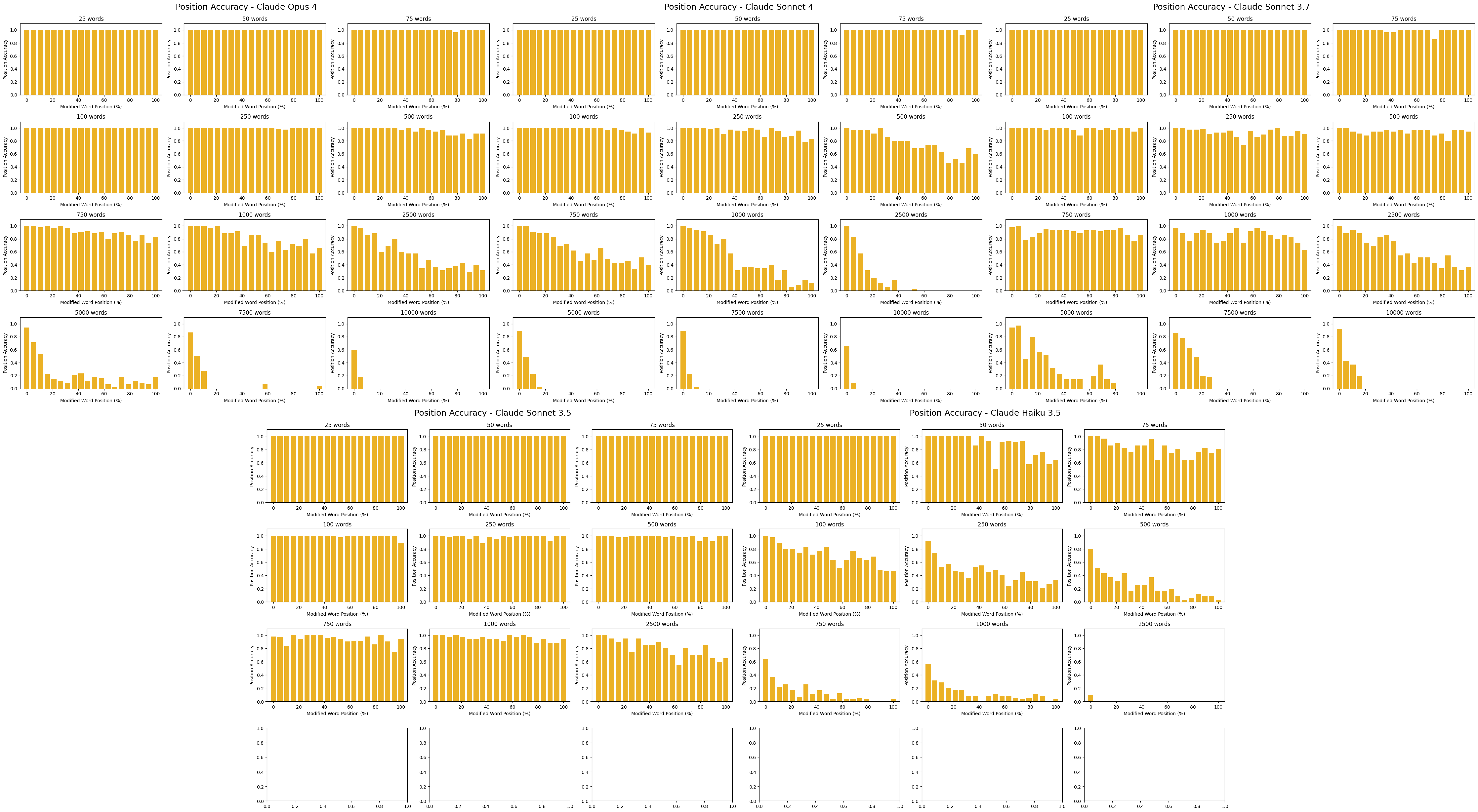 Position accuracy follows a similar trend as GPT models are also more likely to place the unique word correctly when it appears early in the input.