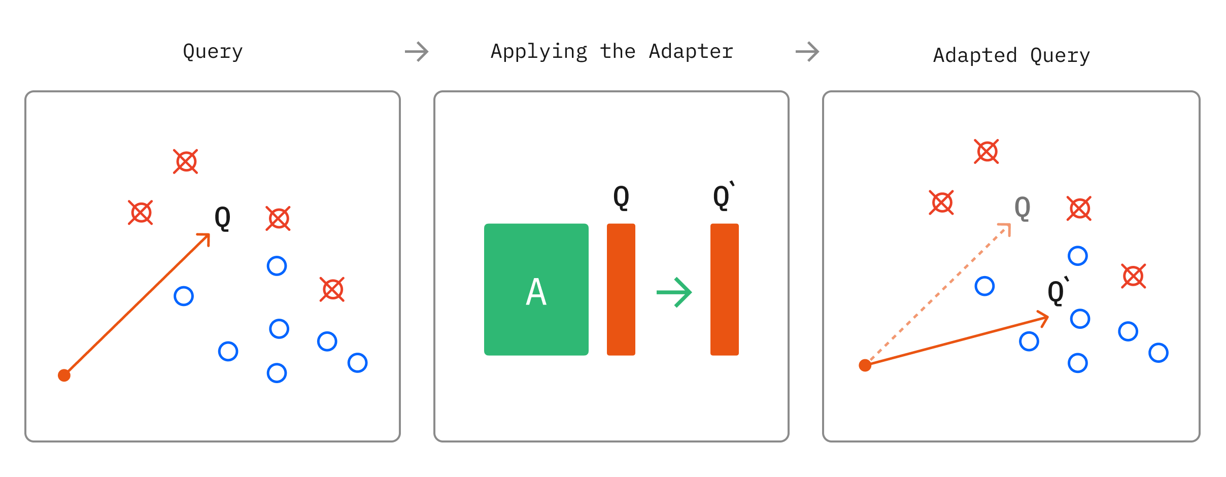 - Query-only linear adapters. In leaving the document embeddings unchanged, these adapters lower the cost of retrieval adaptation by obviating the need to re-embed all of the documents by applying the adapter to all of the documents in the RAG system’s corpus. Instead, the adaptation occurs on the query alone, which is a negligible overhead at query time.