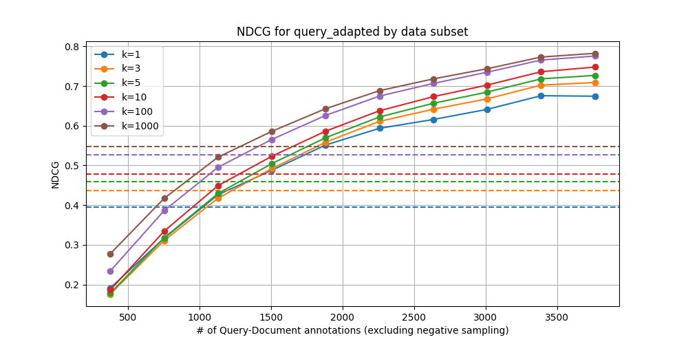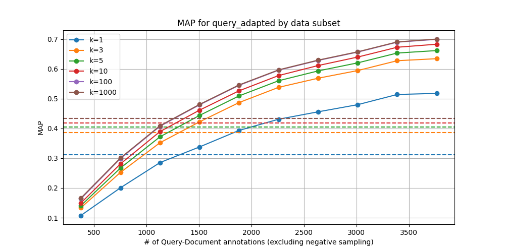 Another avenue we briefly explored was the use of synthetic data to augment our training set. By generating synthetic documents to serve as positive examples for queries, we hoped to augment the data with positives in addition to the negative sampling. However, our initial attempts did not yield significant improvements in retrieval performance. This could be due to the challenges in generating realistic synthetic data that remains in-distribution for the dataset. Due to time constraints, we were unable to fully explore this approach, but we believe that further research into effective methods for generating and utilizing synthetic data could potentially enhance the adaptation process, particularly with the promising results by Wang et al on the use of synthetic data for improving embeddings.