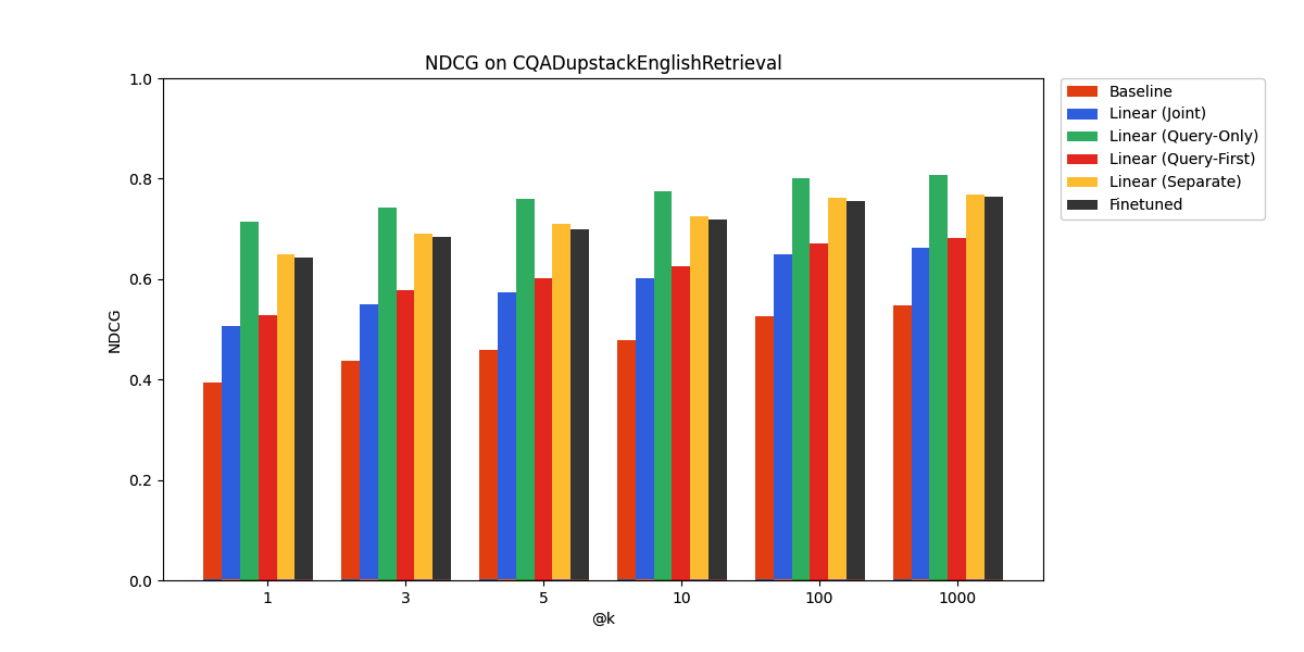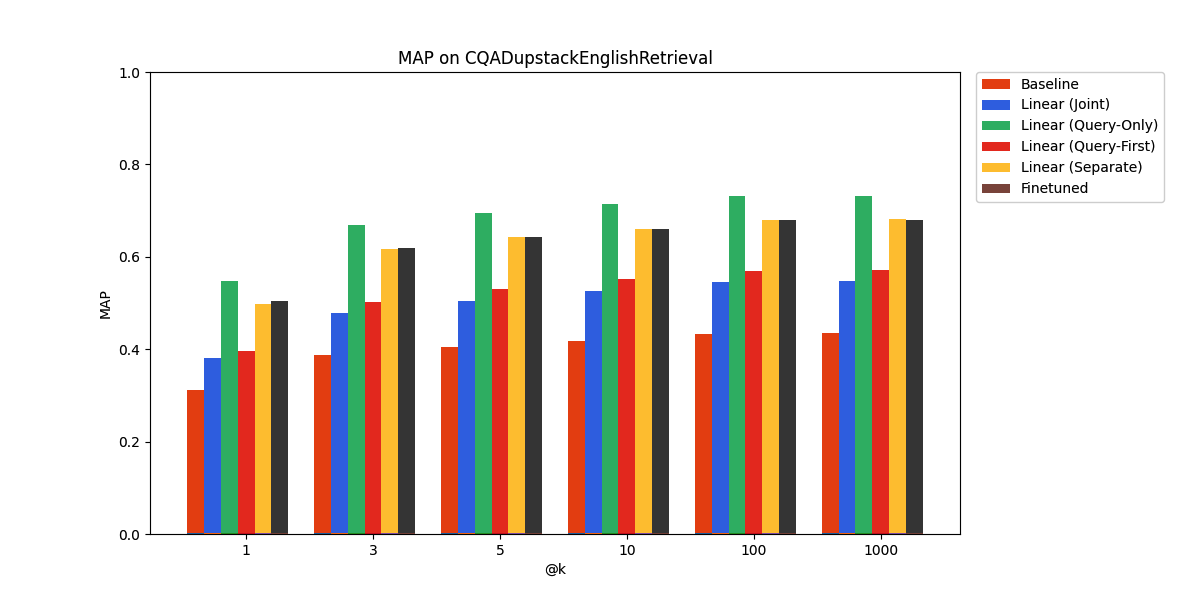 Our results for the linear adapters and finetuning are shown below. All tested approaches outperform the baseline of the pre-trained embedding model.