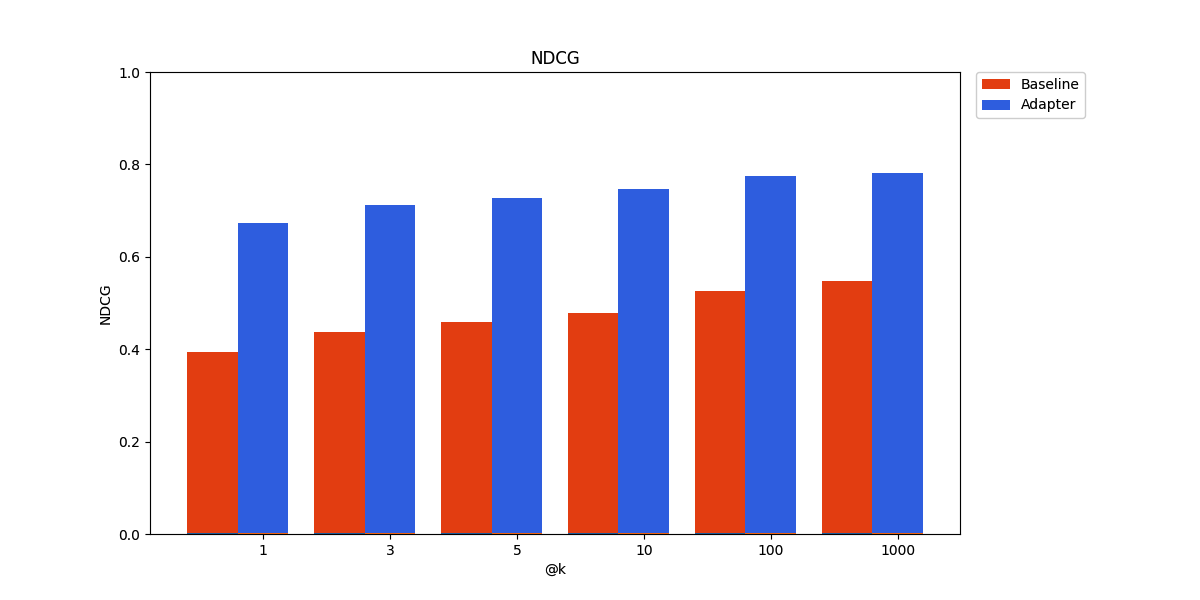 As expected, the performance gains are more modest on the held-out data. In particular, it seems the query-only adapter is at a slight disadvantage compared to the joint linear adapter here. However, it still beats the pre-trained embedding model baseline, demonstrating promise for real-world deployment.
