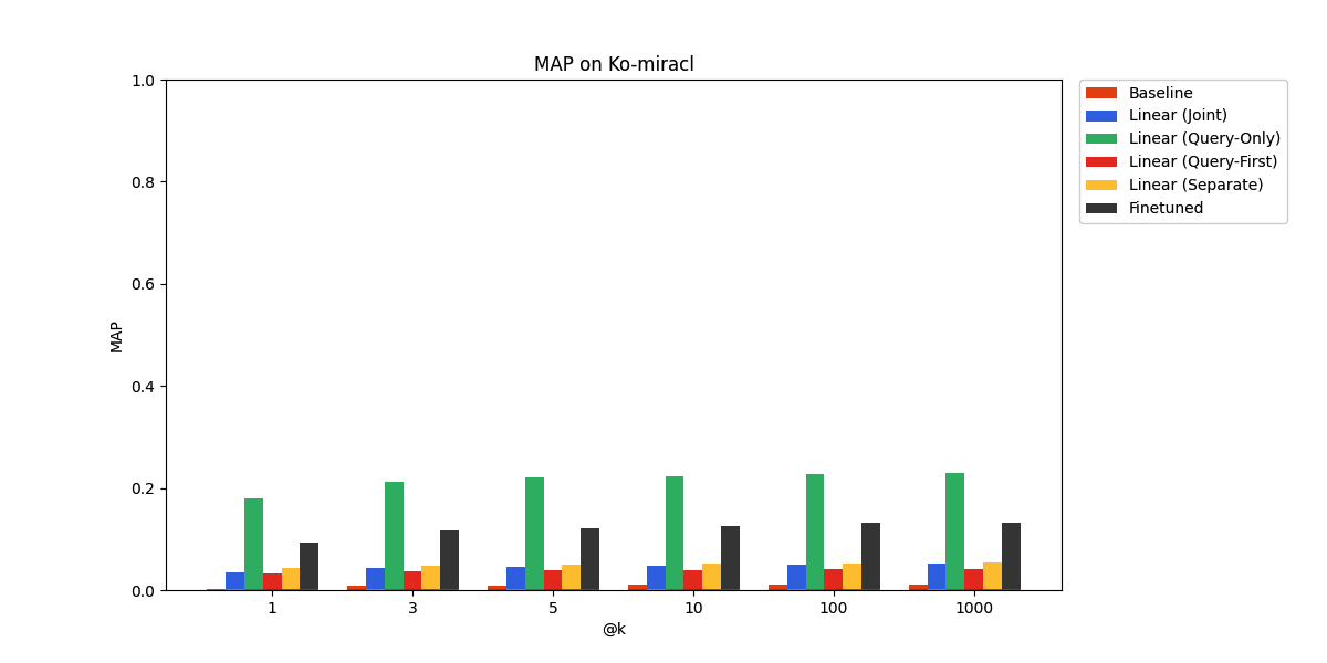 Finally, on Ko-miracl, a Korean language benchmark, the language gap proves too difficult to bridge through our adaptation approaches.