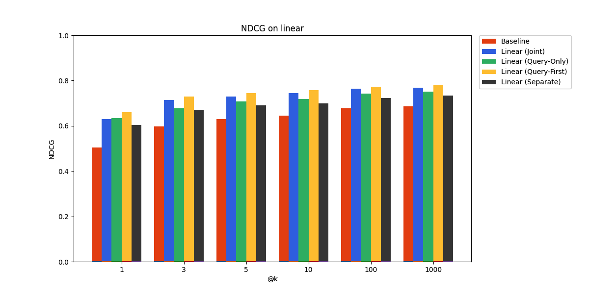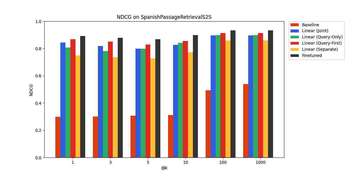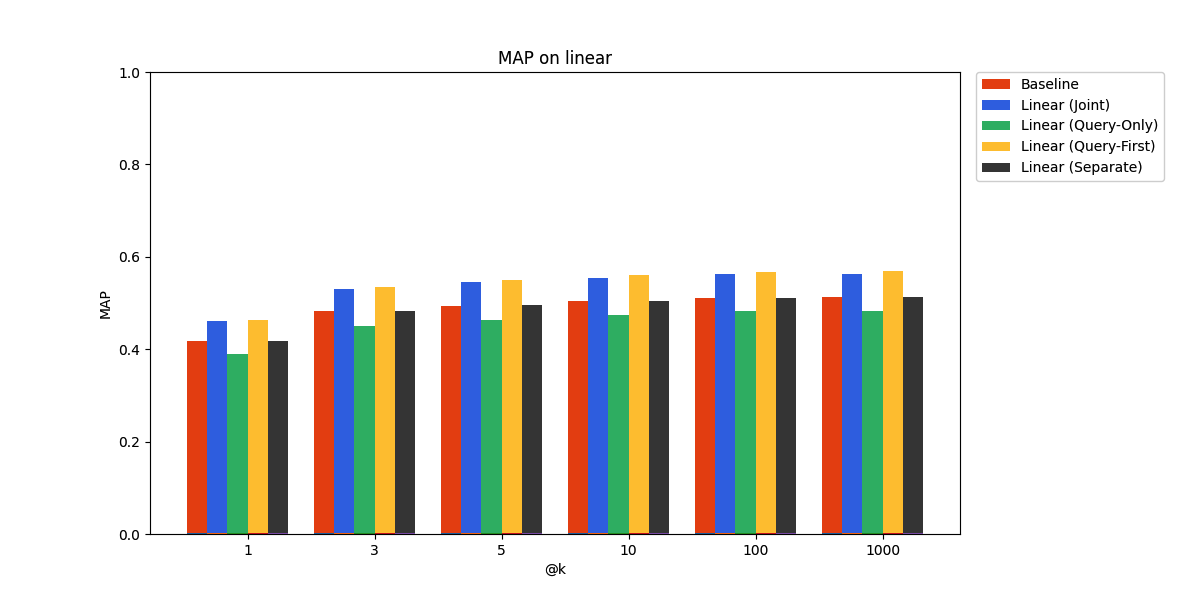 - Joint: both queries and documents are mapped with the same linear adapter.