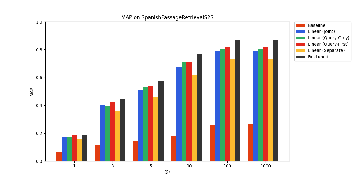 However, we see that a linear adapter is sufficient to yield respectable performance on the benchmark. The fine-tuned approach works best, with the linear adapters not far behind. Once again, the query-only linear adapter is competitive with the other approaches. We suspect that due to similarities in the structure of the two languages, their learned representations have a similar structure, up to a linear transformation, which the linear adapter can learn.